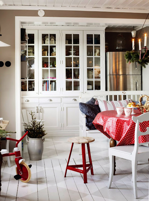 La cocina es el corazón de la vivienda y cuenta con estanterías y armarios hasta el techo donde Linda guarda toda la porcelana, antigua como nueva, y queda a la vista. La mesa de madera junto a la ventana con el banco corrido es perfecta para servir las delicias de Navidad y reunir a la familia a su alrededor. Todo el espacio resulta rico en tradición, con cierto aire rústico, pero con un toque divertido, como Linda. Así es como entiende ella la decoración. Aficionada a la tendencias, la decoración de Navidad en esta vivienda apuesta por los adornos sólidos púrpura y rojos, y con olores como el jabón en toda la casa.