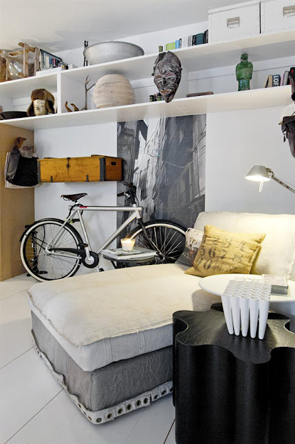 En este apartamento moderno y chic la luz tiene un papel muy importante así como los paramentos verticales, que se han aprovechado al máximo para decoración y zona de almacenaje. Los pisos son cada vez más pequeños pero los muebles no dejan de ser grandes, de ahí que se usen piezas de diseño que hagan varias funciones. Hay que aprovechar las novedades del diseño, descubrir las posibilidades de sillas y mesas plegables o camas que desaparecen. no hay nada más ecológico que reutilizar objetos que ya tienes con otra función. Pequeños guiños al minimalismo con líneas geométricas puras de limpieza visual.
