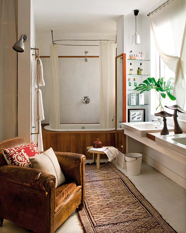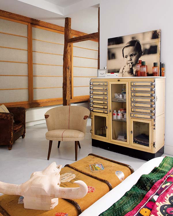 El dormitorio y el baño son mis espacios preferidos de este especial apartamento. Crean una magia personal y un toque vintage perfecto. Lo único que no me gusta demasiado es el esqueleto (cabeza de animal) sobre el baúl a los pies de la cama. El mueble de dentista recuperado de los años 40 es la atracción de toda la habitación.