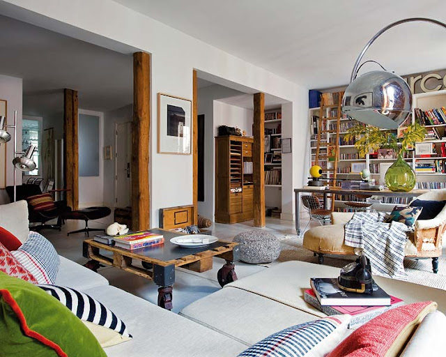 En este apartamento lo antiguo se combina y se transforma en algo moderno resultado piezas llenas de vida y sorprendentes. Casi todos los muebles y objetos han sido recuperados con lo que se consigue singularidad. La estructura dividida en un principio en distintas estancias se ha transformado en una superficie abierta donde las distintas zonas se comunican e interrelacionan y vienen delimitadas por los pilares vistos de madera.