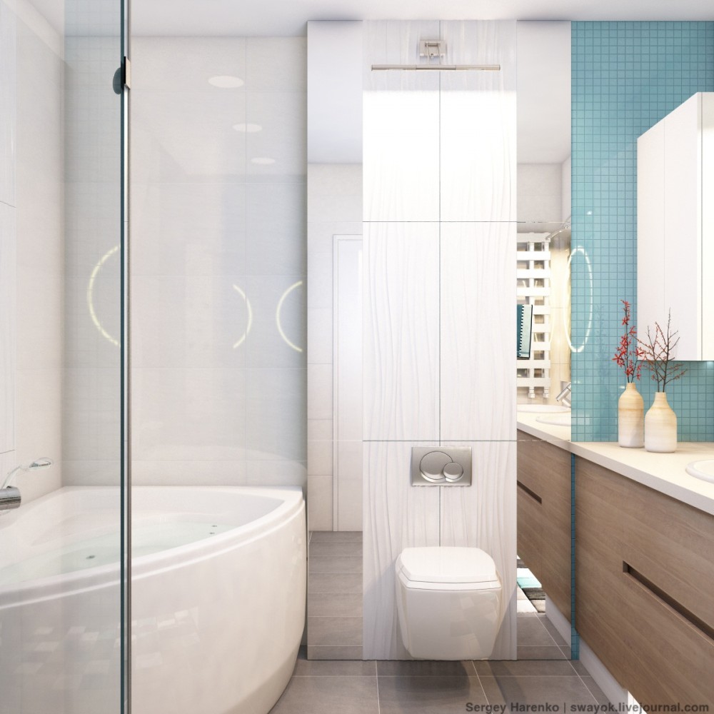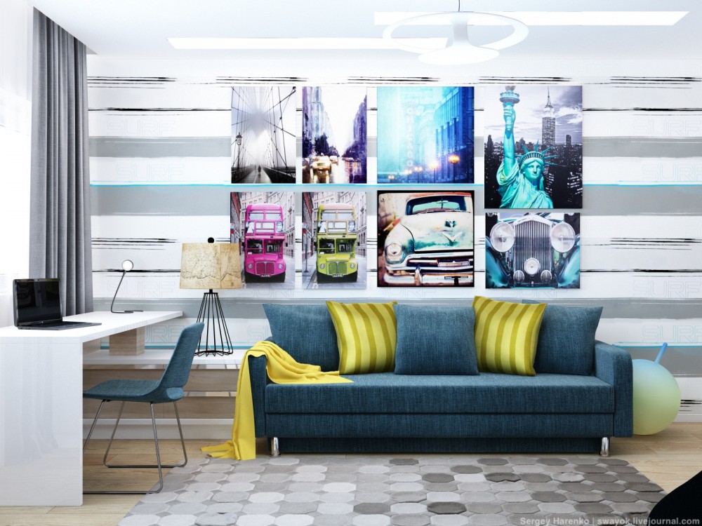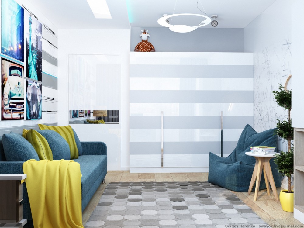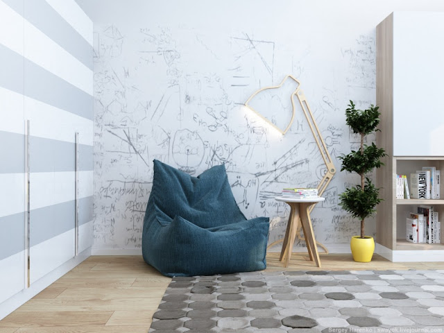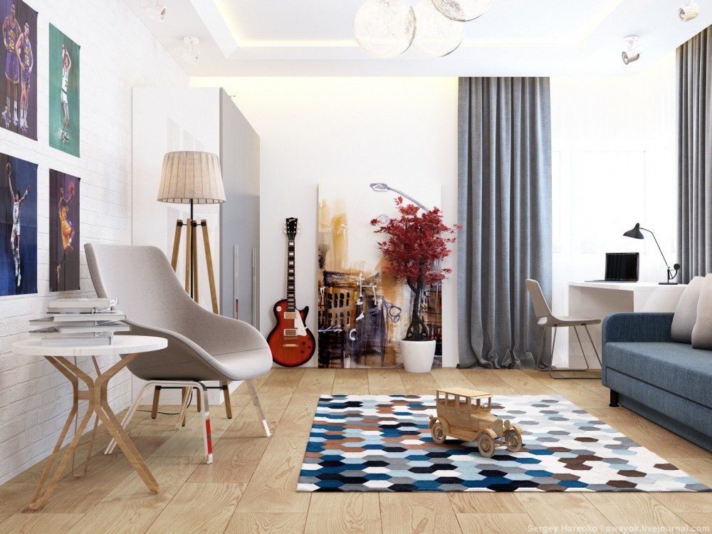 Me encanta mi trabajo como interiorista y paso mucho tiempo recreando en 3D las imágenes de los espacios para mis clientes, pero desde que descubrí el trabajo de Sergey Harenko, mis ganas de aprender y perfeccionar son infinitas. Con increíbles soluciones y una proyección absolutamente completa con materiales, paleta de color y acabados, este apartamento en proyecto se ubica en Kiev para una familia con dos hijos. La reforma planea un espacio abierto en la zona de estar social con una cocina office abierta y comunicada con el salón, aprovechando la estupenda entrada de luz natural desde el ventanal de la misma. Una base de color en blanco para los paramentos verticales que se contrasta con un solado de madera clara para crear profundidad, y apostando por colores con fuerza en sofá, cuadros y plantas.