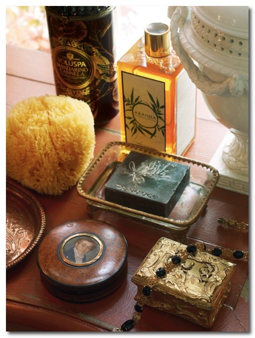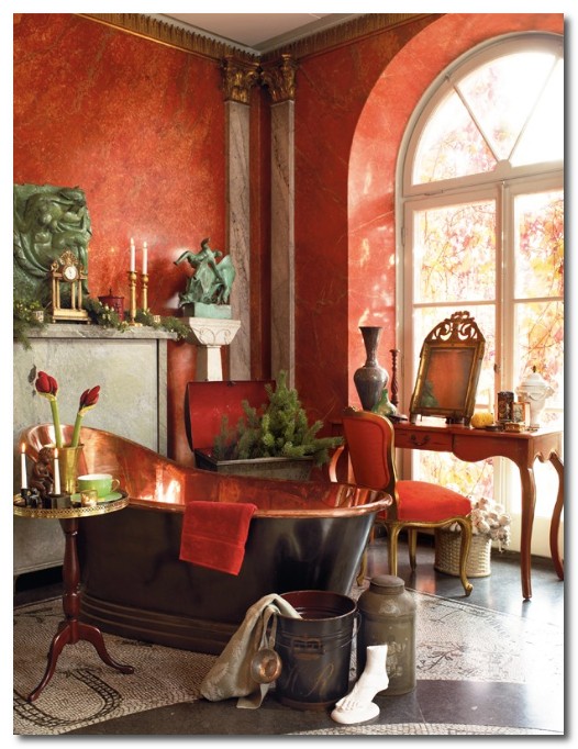 ¿no os apetece una tarde de relax el fin de semana, en un baño como éste, de sabor vintage para relajaros? La ambientación tan opulenta con la bañera de cobre exenta, el tocador vintage con el espejo antiguo de bronce y los toques glamurosos decorativos de la mesa auxiliar, la parafernalia de baño, etc. El suelo en mosaico con teselas le confiere un carácter a veces barroco!