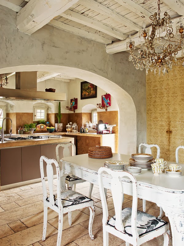 Una cocina que me ha enamorado desde el primer momento con una estética campestre sin excesos de amplias dimensiones con mesa y sillas heredadas, restauradas con una pátina envejecida y retapizadas por los propietarios.