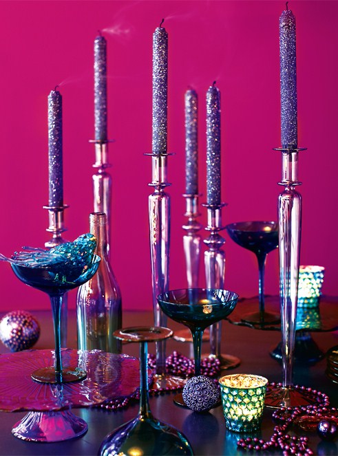 La opulencia lúdica es un elemento clave aquí, así que utiliza velas en portavelas llamativos, servilleteros, platos y vasos con un poco de chispa. Muchas capas de diferentes texturas en el esquema con adornos brillantes, cuentas de colores y lentejuelas hacen que prestes más atención al conjunto. Y en vez de colocar la típica flor de Pascua tradicional, usa algunas flores naturales en tonos rosas y morados que complementen la idea de glamour. Mezcla claveles de bajo coste con exóticas orquídeas, por ejemplo. Todo tiene que resultar muy informal y sutil.