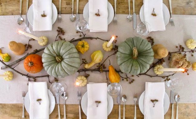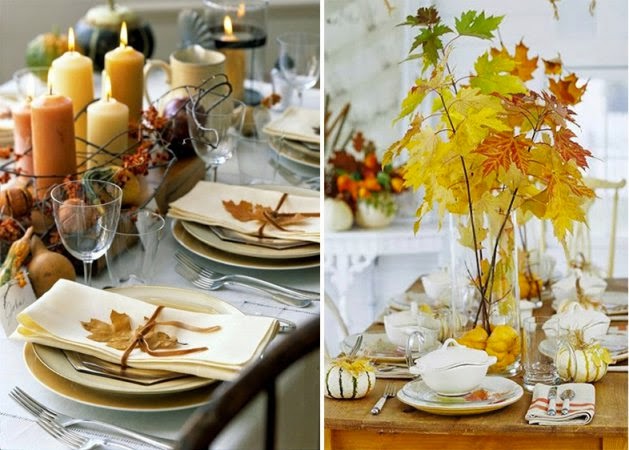 Para encontrar ideas para esta evento y acorde a la estación que vivimos, basta con mirar por la ventana. Las hojas de otoño que están cambiando sus tonos de verde a los colores calientes típicos en amarillo y la gama de anaranjados, te pueden servir para tus composiciones decorativas llenas de elementos reciclados y mucho sabor a «campo». Además son elementos «low cost» que todos podemos permitirnos. Las hojas se pueden poner en un jarrón con flores o, en lugar de ellos, se pueden poner perfectamente en un plato, en un porta velas transparentes … Para fortalecer este gran espectáculo colorista de color amarillo-naranja, trata de escoger los textiles y el mensaje (pero sólo uno o el otro) en el tono de las hojas.