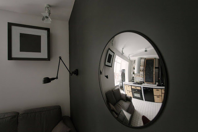 Se hace hincapié en el color negro y su contraste con el blanco en la cocina. La caldera de gas se cubre por una pizarra para poder escribir la lista de la compra. El uso de azulejos de pequeño formato, crea un contraste para resaltar la geometría y su forma, con el llagueado en negro, haciendo un guiño a Piet Mondrian, quien creía que las líneas se cruzan en ángulo recto. El amplio dormitorio encaja tres armarios empotrados. La zona de la mansarda se usa como lugar de trabajo. También hay un colchón adicional para los huéspedes en una especie de «sala oscura» con cortinas rojas. Los diseñadores han tratado de personalizar todos los muebles.