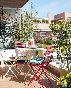 – En una pequeña terraza urbana puedes puedes protegerte de las miradas de los vecinos con plantas y arbustos de cierta altura. Para no recargar el espacio opta por una mesa redonda y dos sillas de acero y madera, en colores suaves y femeninos (rosa, amarillo pastel, beige, etc.).