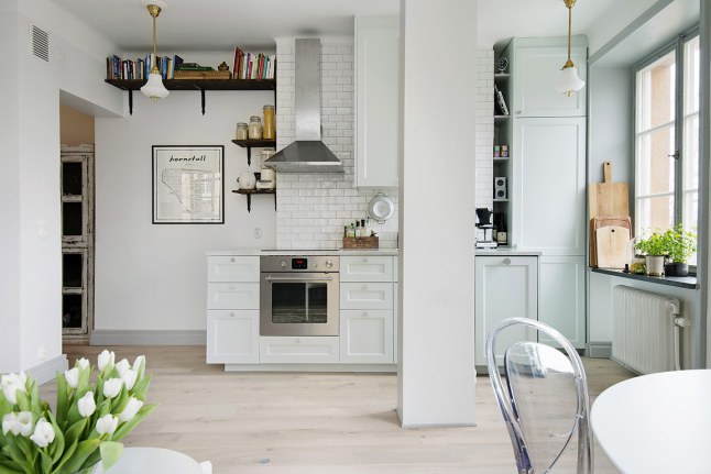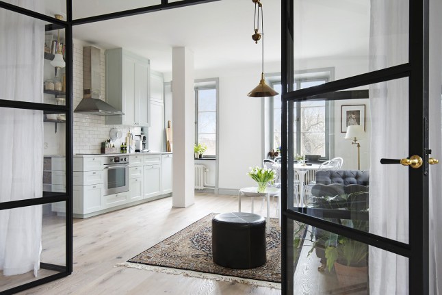 Un espacio pequeño a modo de única estancia que une salón y cocina, y un sólo dormitorio que tiene una particularidad muy especial que lo convierte en algo único y que lo introduce en la zona de estar. Se puede ver claramente que el objetivo principal que se buscaba a la hora de reformar esta vivienda era conseguir la mayor sensación de amplitud posible. La paleta de base neutra de paredes y techo blanco, y suelo de madera en color muy claro casi gris es la clave. Al eliminar el tabique que separaba el dormitorio del salón y sustituirlo por un enorme cerramiento de cristal y estructura metálica de cuarterones, la sensación de desahogo es mucho mayor, y la entrada de luz se duplica. Y en caso de querer ocultar el dormitorio, basta con correr las cortinas blancas que han colocado detrás de las puertas. Genial idea ¿verdad?