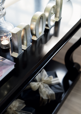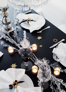 La decoración de la mesa para la cena navideña es ideal: ramas de vidrio esmerilado, colocadas a lo largo del centro de la mesa, cintas de negro atando las servilletas blancas y estrellas de oro esparcidas por el negro del sobre de cuero de la mesa.