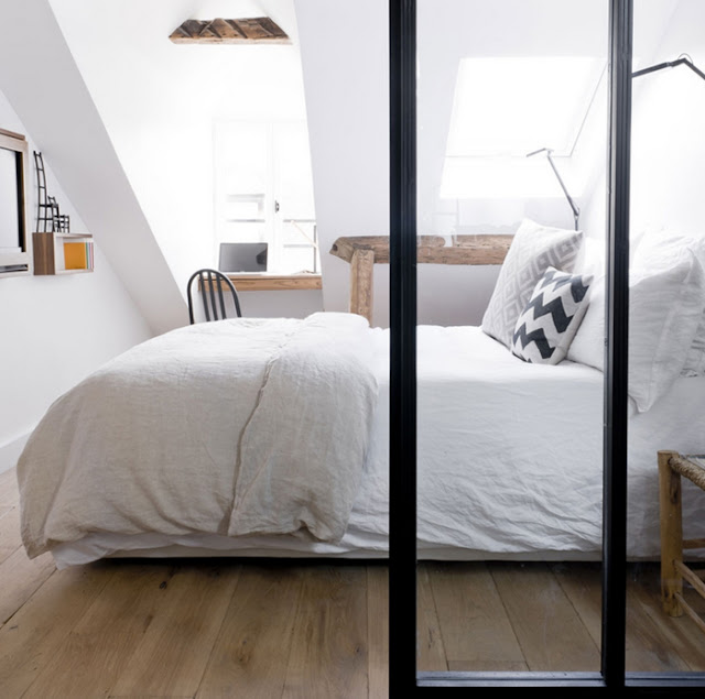 La zona de salón al estar abierta permite tener perspectivas transversales de una ventana a otra, pero para ganar intimidad cuentan con grandes cortinas. Para aumentar aún más la sensación de espacio, las paredes se dejaron en blanco brillante para reflejar la luz natural. Situado en pleno corazón del barrio de Marais, en un edificio del siglo XVIII, esta reforma la realizó Margaux Beja. El dormitorio se separa del resto del espacio con una sencillas puertas de vidrio y perfilería metálica en negro de estilo industrial, que permiten aislar el dormitorio, pero sin quitar luz natural a la zona de la cocina. Las preciosas vigas vistas recuperadas en su color destacan en el blanco impoluto de las paredes, y toda la fuerza decorativa la tiene el contraste blanco, negro y madera.