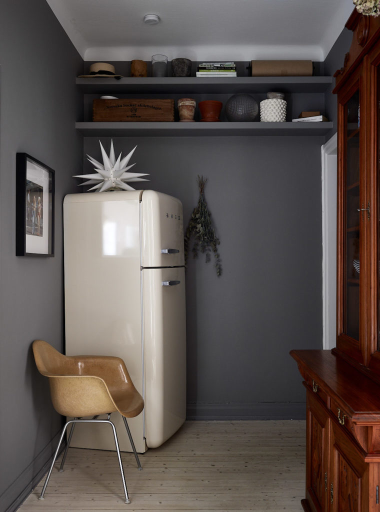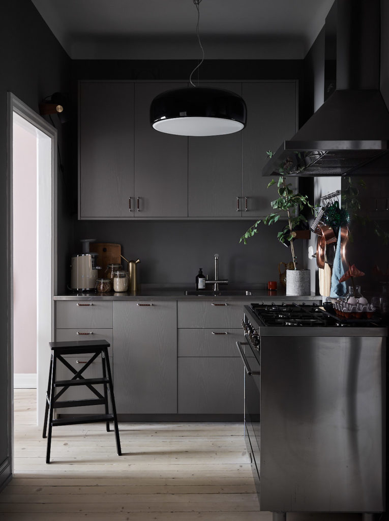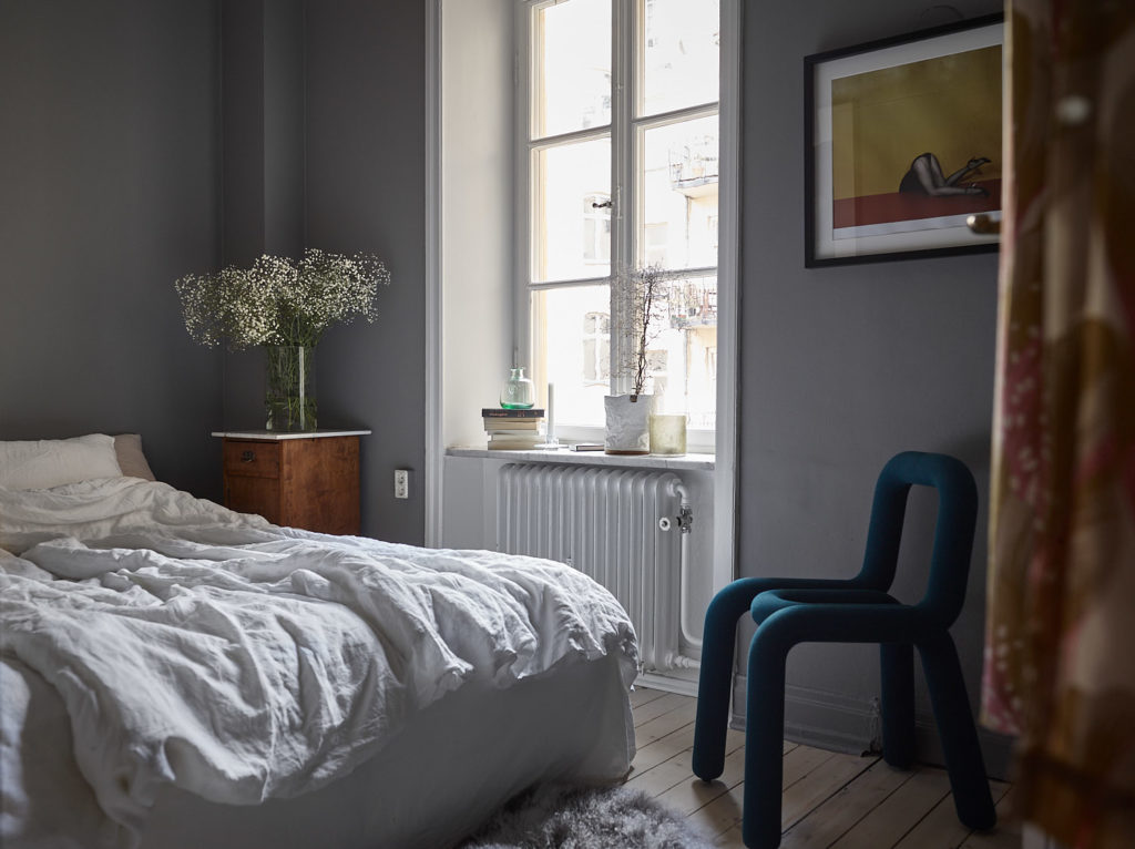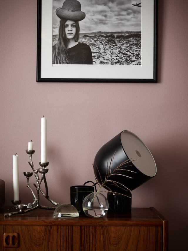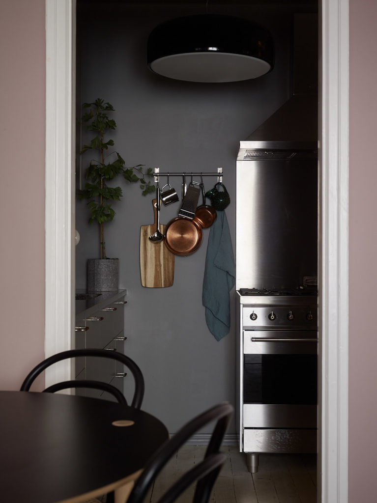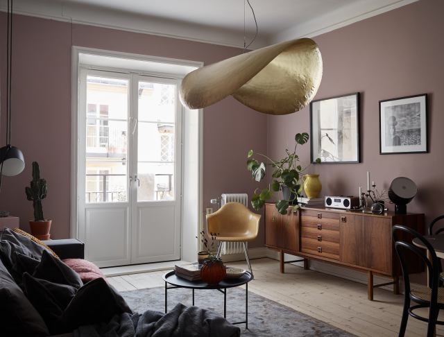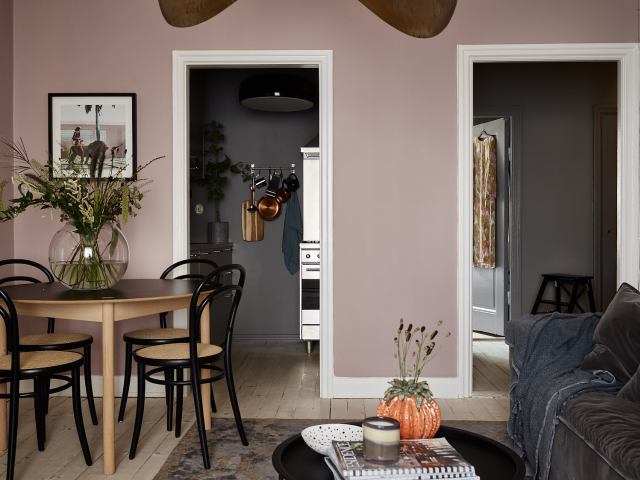 Con una altura de techo generosa, el apartamento está pintado en colores bien elegidos. Un cálido y mate color ‘pink blossom’ en las paredes visten los espacios y los hacen suaves y acogedores. Las carpinterías se han pintado de blanco y contrastan bien con este color.