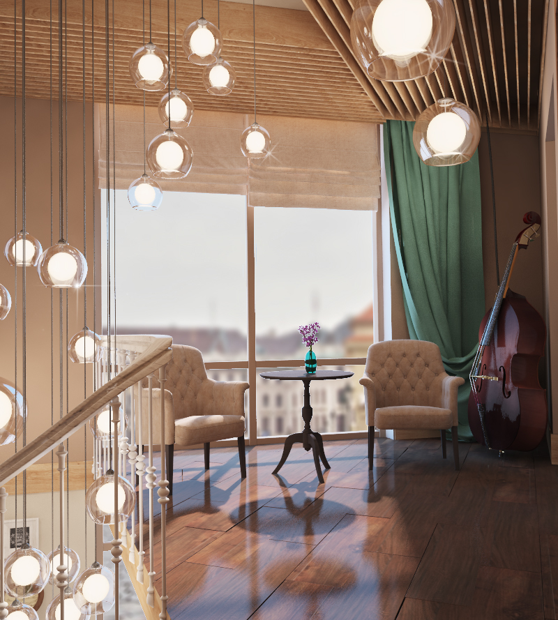Con una planta complicada en principio por la forma geométrica del espacio, se consigue crear una distribución que funciona con una zona de piano que ameniza las veladas de comidas y cenas en el local. El techo es un ejercicio de elementos en madera y diseños a medida que crean la acústica perfecta para el sonido del piano y a la vez, crea calidez. Las luces colgantes de bombillas en forma de racimos juegan con las alturas y caen sobre el hueco de la escalera de forma original. La mezcla del azul aguamarina y la madera funciona creando un ambiente sereno y elegante.