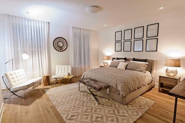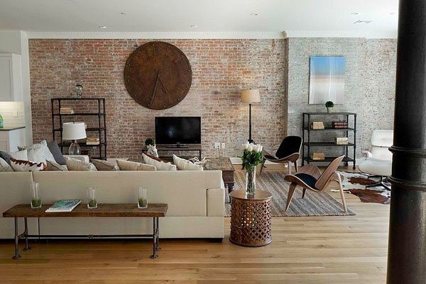 El sofá crema de lino ocupa un lugar central, con su mar de texturas (los cojines ), dándole carácter, confort y exclusividad. El salón combina líneas modernas, de las sillas en madera de nogal y tela con elementos rústicos, como la mesa de café de tipo Indonés, el gigante y antiguo reloj de pared del hierro y la alfombra de yute hecha a mano, que establece el viejo tono de la decoración para un interior excepcional. Un cómodo sillón Eames Lounge te invita a entrar, dando la espalda a una pared de ladrillo macizo visto. El diseño es abierto y fluido para mantener la sensación de grandiosidad del espacio por lo que cada pieza y acabado de diseño se pueden admirar individualmente.