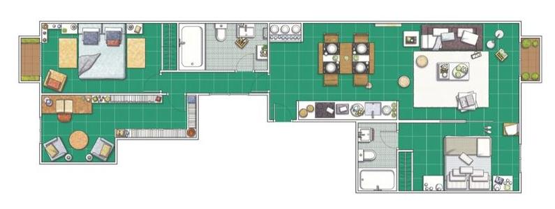 La decoración es algo ecléctica pero con una base de colores neutros y blancos, combinados con madera y un solado precioso en verde botella ideal que unifica el espacio creando una sensación de serenidad y sobriedad. En cuanto al mobiliario encontramos piezas sencillas y muy funcionales con diseños vanguardistas y muebles auxiliares de madera natural. En gerenal el mobiliario es ligero y de reducido tamaño, para facilitar la circulación por la casa.