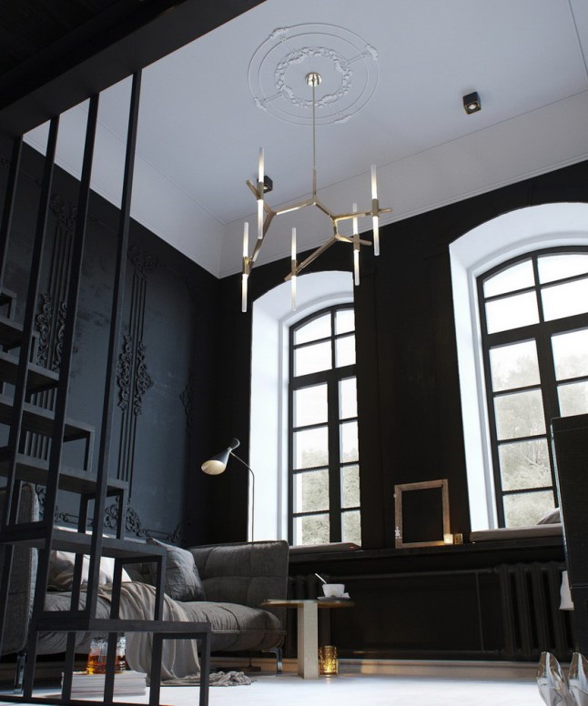 Este estupendo mini loft de apenas ¡24 m²! que he descubierto pertenece a una vivienda, que se ha subdividido en estancias tipo estudio para alquilar en Rusia. Estos pequeños apartamentos tienen mucho estilo industrial chic con un toque masculino y elegante, aunque el proyecto interior parte de ser un espacio diseñado para una mujer joven. El proyecto lo ha realizado la interiorista TatianaShishkina, y gracias a los 3,80 mt de altura de techo, se ha ganado y aumentado en superficie habitable realizando un altillo a modo de planta dúplex que alberga el dormitorio. La barandilla metálica y la escalera del mismo material a modo de estructura translúcida que permite ver todo el conjunto de un vistazo y a la vez sirve de protección física y visual entre las dos plantas. Un concepto de liegereza muy personal y acertado en este mini espacio que separa la sala de estar y la cocina.