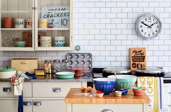 Pero tampoco queremos que la cocina parezca de verdad una de hace más de medio siglo, así que hay que darle un toque moderno, y dotarla de las comodidades propias de hoy en día. Taburetes hidráulicos, lavavajillas u hornos de aire comprimido… Los pequeños detalles decorativos también marcan la diferencia y complementan el estilo retro. En las casas de las abuelas o en diferentes anticuarios o mercados puedes buscar elementos característicos de cada época para que le den vida a la cocina (frascos de diferentes medidas, teteras, tazas estampadas, carteles de chapa enlosados y carameleras de vidrio pueden darle el toque final al espacio). También hay elementos actuales que remiten a lo antiguo.