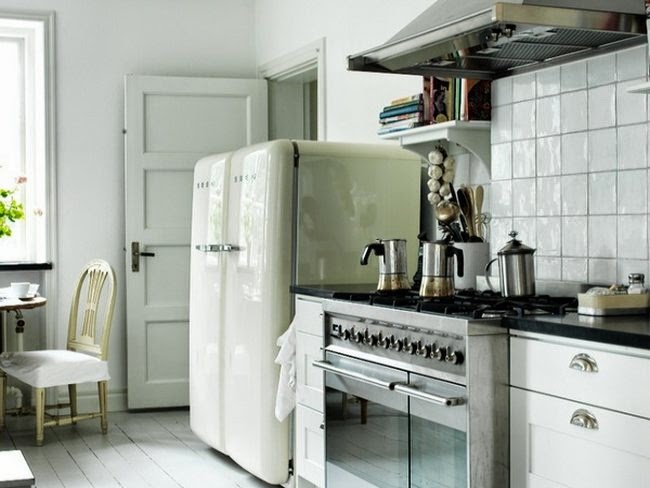 La cocina es una de esas estancias que corre grandes riesgos de quedarse obsoleta y desfasada de estilo con en el transcurso de unos pocos años. El diseño de muebles de cocina evoluciona rapidísimamente, y los electrodomésticos cambian también a gran velocidad y los nuestros se quedan «antiguos» en un abrir y cerrar de ojos. Si no queremos estar cambiando nuestras cocinas y se queden pasadas de moda cada diez o quince años, o si simplemente nos gusta el look de las cocinas de hace cincuenta o más años, esta es la solución. Para ello, nada mejor que elegir un electrodoméstico con aires del pasado, como el ya clásico frigorífico Smeg, o una cocina y accesorios de hierro esmaltado de esos que tenían nuestras abuelas. Y unos buenos azulejos blancos que soportan muy bien el paso del tiempo.