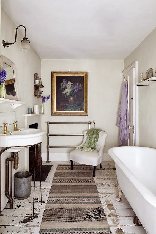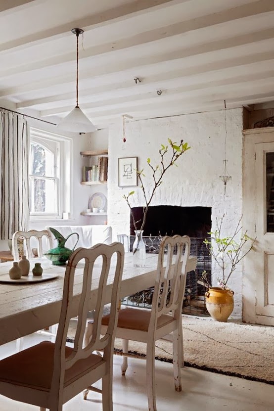 Las porciones de color blanco y suelos recuperados nos recuerdan lass casas antiguas de campo inglesas. Me encanta la vieja chimenea de piedra en el comedor que la hacen cálida y acogedora. El gusto por los elementos naturales, las vigas en el techo y los detalles rústicos, dan un poco más de encanto al conjunto. Es una perfecta casa deestilo british en blanco. Encaramada en lo alto de la casa, la biblioteca de la oficina encuentra su lugar natural en esta habitación que parece un viejo granero. Estanterías enteras comparten las paredes de este lugar acogedor que invita a la lectura. Se remata con una alfombra púrpura de Marrakech, un sillón escandinavo de los 50’s cubierto con una colcha de patchwork con viejos tejidos, lugar perfecto para empezar una novela.