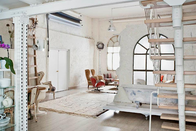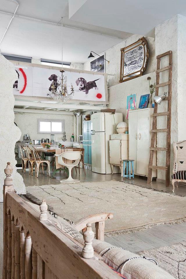 Utilizar el color blanco como base es la clave de toda la decoración vintage, pues se trata de un color que potencia la luminosidad y tienen el poder de “ampliar visualmente” cualquier espacio y además, dejará todo el protagonismo a las piezas de mobiliario y complementos. La mezcla de objetos y estilos es lo que aporta tanto encanto a este loft con cierto aire industrial en su base. El espacio contaba con un cierto grado de deterioro, lo cual exigía una rehabilitación. La nueva distribución se caracteriza por un espacio diáfano o comunicado mediante escalera y panel de madera con ventana de cuarterones de cristal donde se coloca la bañera, de este modo tenemos diferentes ambientes como el salón-comedor, cocina y baño. La decoración evoca a ambientes de estilo bohemio, más propios de los lofts neoyorkinos de mediados de los ochenta. Para crear ese efecto jugaron con dos elementos: materiales industriales y muebles de aires retro-vintage.Me deja sin palabras!!