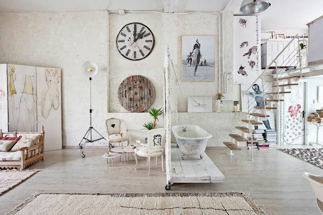 Utilizar el color blanco como base es la clave de toda la decoración vintage, pues se trata de un color que potencia la luminosidad y tienen el poder de “ampliar visualmente” cualquier espacio y además, dejará todo el protagonismo a las piezas de mobiliario y complementos. La mezcla de objetos y estilos es lo que aporta tanto encanto a este loft con cierto aire industrial en su base. El espacio contaba con un cierto grado de deterioro, lo cual exigía una rehabilitación. La nueva distribución se caracteriza por un espacio diáfano o comunicado mediante escalera y panel de madera con ventana de cuarterones de cristal donde se coloca la bañera, de este modo tenemos diferentes ambientes como el salón-comedor, cocina y baño. La decoración evoca a ambientes de estilo bohemio, más propios de los lofts neoyorkinos de mediados de los ochenta. Para crear ese efecto jugaron con dos elementos: materiales industriales y muebles de aires retro-vintage.Me deja sin palabras!!