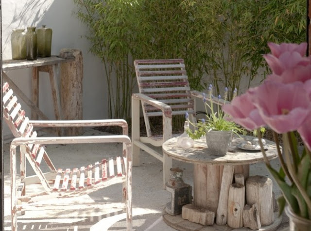 Al abrigo del viento, este pequeño rincón de vegetación se extiende hasta la sala de estar: Muebles de madera en el patio con una mesa de café que crea una vivienda improvisada como alternativa de verano para el sofá junto a la chimenea del invierno. Un remanso de sueños, una ubicación ideal para explorar la isla de Ré y la naturalidad de estas casas de vacaciones donde cualquiera querría perderse.