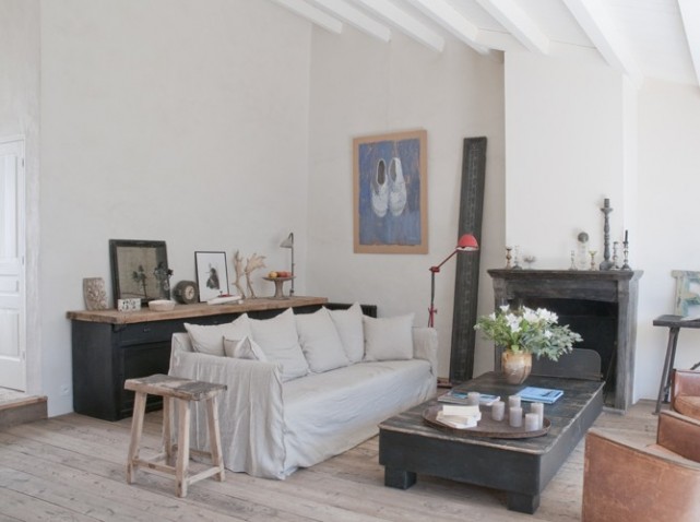 En el interior, el «loft» inspira movimiento que destaca por un hermoso solado de madera recuperado que unifica los diferentes espacios. La unidad se basa en el color blanco, presente en todas partes, que sólo se interrumpe por las dos paredes de ladrillo rojo y los toques oscuros de algunas piezas como la chimenea de pizarra, las ventanas de marco de acero, las sillas y muebles pintados de negro. La disposición del mobiliario, muy gráfica, es aún más notable ya que el espacio está muy despejado. De hecho, para evitar la acumulación de la sala, una gran proporción de zona de almacenamiento se ha colocado fuera de la vista, en el garaje o en la despensa.
