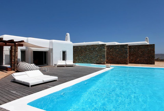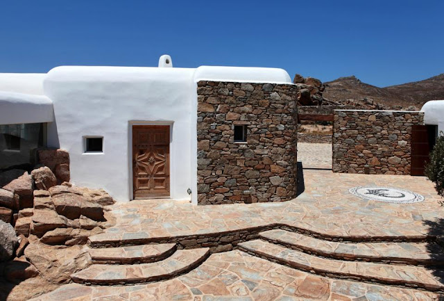 Diseñada por el renombrado arquitecto catalán Javier Barba, esta casa está considerado como una de las más impresionantes de la isla de Mykonos. El concepto de diseño tiene estrechos vínculos con la arquitectura tradicional de la isla, las cúpulas curvas, los muros redondeados y los tubos de chimeneas junto con las paredes de piedra encaladas en blanco característico proporcionan el refugio contra el calor abrasador y los vientos del norte, muy común en Mykonos durante los meses de verano. El diseñador francés Christian Liaigre es el responsable de los muebles interiores de esta casa tan singular, que rezuman elegancia y confort. Los tonos neutros y de la tierra junto con las vigas de madera, las columnas señoriale, los suelos de parquet y cemento de color en el interior de esta casa espectacular isla.