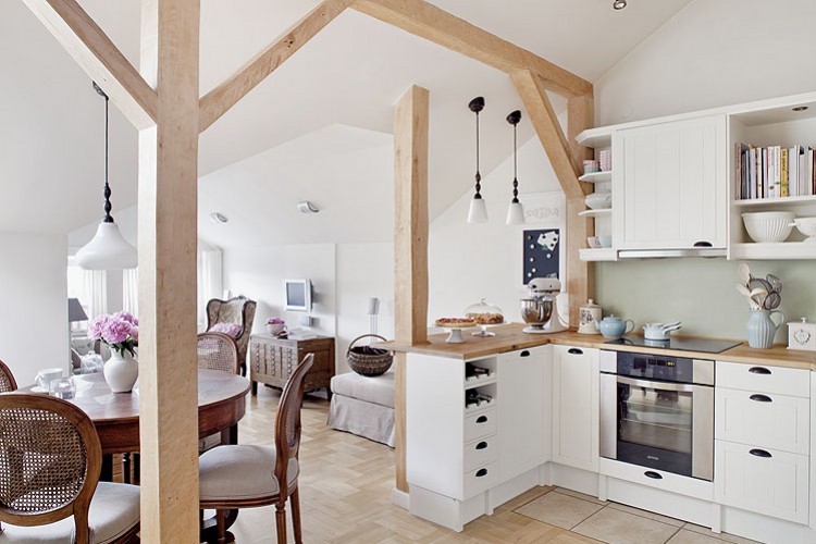 El juego de cerchas de madera a modo de separador de ambientes, junto con el juego de techos inclinados, crea una sensación de ático abuhardillado del espacio, que le confiere mucha más personalidad y calidez. Muchos de los complementos y detalles nos recuerdan a un espacio de estilo shabby chic con reminiscencias vintage revisadas. Las imágenes hablan por sí mismas.