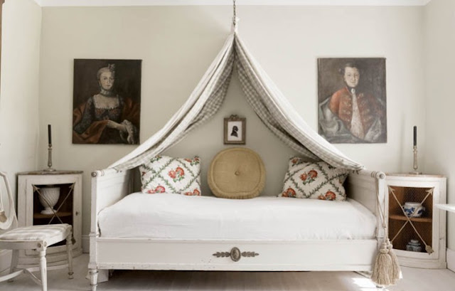 Los dormitorios en la planta de arriba, son de estilo clásico, con dosel sobre las camas que les confieren un aspecto refinado, reforzados por los detalles vintage de retratos, mesitas de noche, etc.