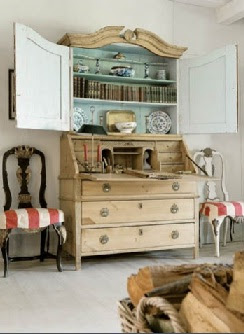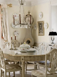 Los interiores han sido pintados con colores cálidos y suaves, de estilo típico sueco. Pero la decoración es ecléctica. Hay un montón de antigüedades «copias». Algunos muebles son antigüedades pero la mayoría provienen del reciclaje de viejas piezas creadas a propósito para esta propiedad. Eso es porque el original es difícil de encontrar y muchas veces tienen un precio prohibitivo. Así, sus dueños compran un viejo aparador o mesa, cogen un pincel y pintan y envejecen ellos mismos. Tratados de una forma similar, los marcos de espejos y pinturas que cuelgan en la casa. Los objetos son creados de forma única y elegante al mismo tiempo.
