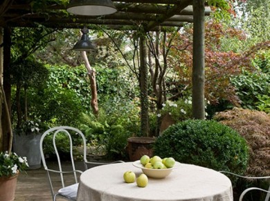 La pérgola cubierta con abundante vegetación, se presta a la relajación y se apoya sobre grandes troncos.