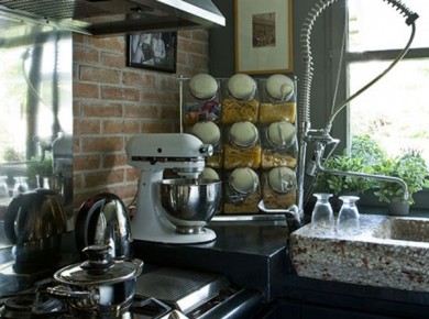Pintada de gris, la cocina crea una ruptura interesante con el resto de la casa, donde el fregadero de aglomerado, la pared de ladrillo visto, y los utensilios de cocina decorativos, generan un entorno de trabajo industrial-vintage.