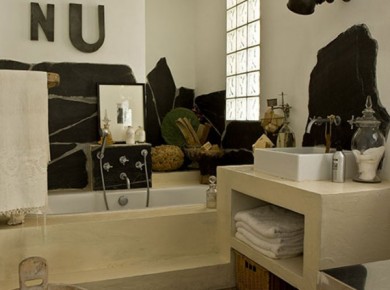 En el cuarto de baño, el mueble del lavabo y la bañera están realizados con elementos de mampostería pintados de blanco. El contraste con el fondo oscuro de la pizarra le da profundidad. El suelo con grandes listones de madera, acentúan el lado rústico de la estancia.
