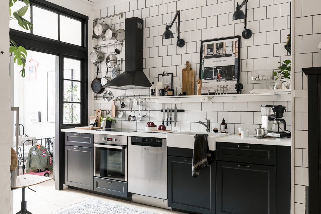 Destaca la sencillez y naturalidad, con ausencia de excesos, creándose un ambiente relajado y práctico de corte industrial. La cocina es uno de los espacios con más singularidad. En una paleta en blanco y negro, el espacio abierto con baldas a la vista, ofrece la fusión perfecta entre el estilo industrial y el nórdico. El ladrillo visto recuperado de la pared, refuerza el estilo. Combinar ambos estilos, aunque no lo creas, es francamente sencillo. La idea es que el resultado sea luminoso, básico en la decoración nórdica. Se apuesta por el color blanco para paredes y superficies amplias. Si os dais cuenta, se añaden colores como el gris o el marrón, muy típicos de la decoración industrial.