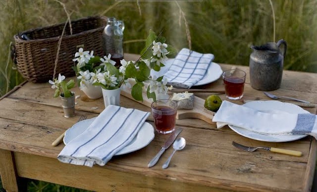 En cuanto a la vajilla y los textiles, utiliza manteles, servilletas y galletas de sillas y sillones, de tejidos frescos y fácilmente lavables y líneas sencillas. Se pueden elegir en conjunto o bien haciendo distintas y originales combinaciones, consiguiendo un estilo más personal. Los centros de mesa serán más o menos elaborados según la mesa de la que dispongamos, buscando el equilibrio entre adorno y espacio.