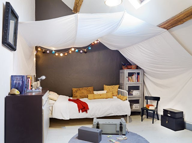En la habitación de su hijo, Alexandra se recrea en la cubierta, con una sábana de lino blanco sobre las ballenas que se enganchan a las vigas, creando una escenificación típica de las acampadas al aire libre.
