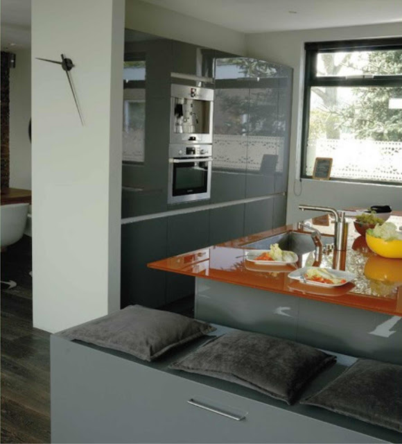 La combinación de color es perfecta: un gris antracita que combina con toques naranjas de la encimera, la madera de la mesa…