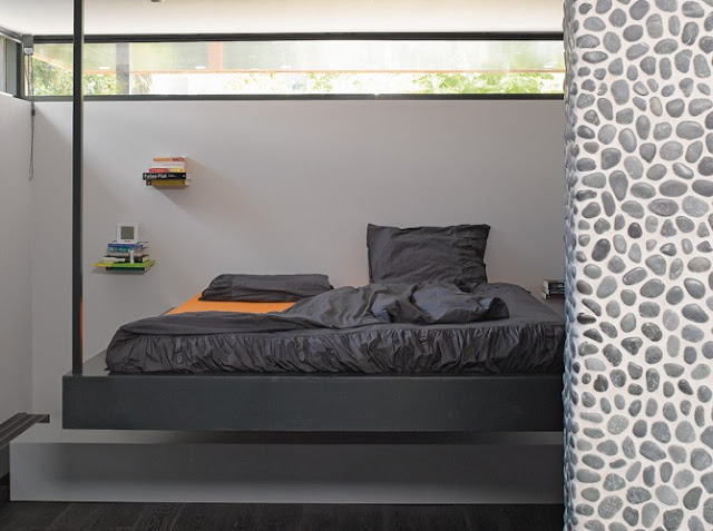 El baño hecho in situ a base de guijarros negros, se diseña como un spa tranquilo y lujoso, y se extiende al dormitorio en el que la cama, con base de madera, emerge de forma sutil suspendida del techo por viguetas de acero.