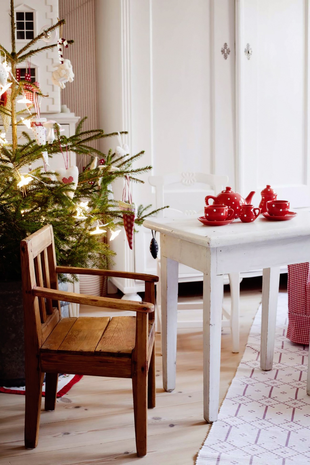 La cocina es el corazón de la vivienda y cuenta con estanterías y armarios hasta el techo donde Linda guarda toda la porcelana, antigua como nueva, y queda a la vista. La mesa de madera junto a la ventana con el banco corrido es perfecta para servir las delicias de Navidad y reunir a la familia a su alrededor. Todo el espacio resulta rico en tradición, con cierto aire rústico, pero con un toque divertido, como Linda. Así es como entiende ella la decoración. Aficionada a la tendencias, la decoración de Navidad en esta vivienda apuesta por los adornos sólidos púrpura y rojos, y con olores como el jabón en toda la casa.