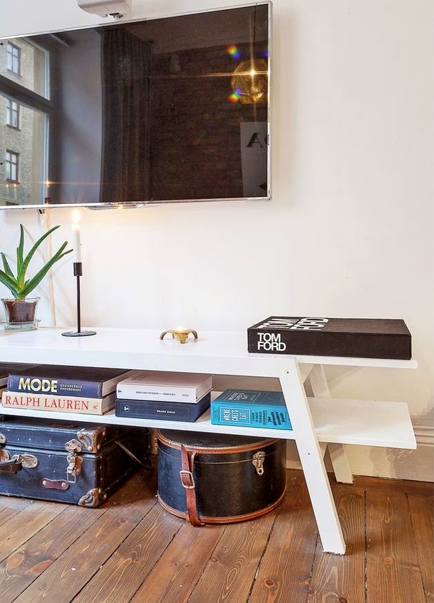 Me encantan los caballetes apilados contra la pared a modo de mesa de entrada y recibidor. Una idea práctica, low cost y que permite almacenaje de forma divertida. Luces de estilo industrial, cajones reciclados como mesillas de noche, una colcha de piel sintética y almohadas a juego , etc., contrastan su inclusión en una habitación tan blanca. Un mini apartamento de 10 ¿qué os parece a vosotros?