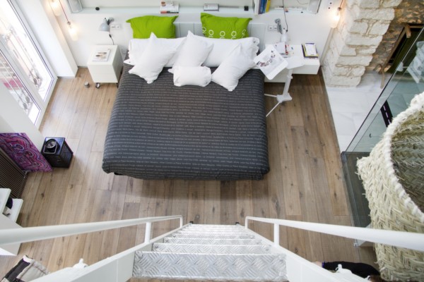 Destaca la cama del dormitorio principal, prácticamente suspendida en el aire que se sostiene por un soporte regulable en el centro, creando un ambiente agil y con mucha personalidad.