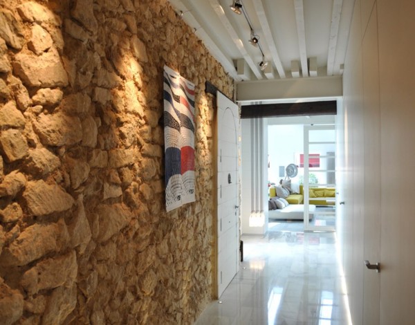 En esta vivienda se renuncia casi por completo al uso de los colores, característica principal de la firma de diseño. La cocina es completamente blanca en contraste con las paredes, sillas y la lámpara de techo en negro. También en blanco se diseña el espacio de salón-estar, con un aire muy industrial de loft newyorkino. Paramentos verticales y mobiliario se visten del un «sin color» y un espectacular suelo de mármol de gran formato en tonos claros. La profundidad de los espacios los dan los toques de color de algunos detalles decorativos en negro, el sofá modular en color mostaza y el sillón Huggy de estilo «patchwork», rompiendo la monotonía cromática.