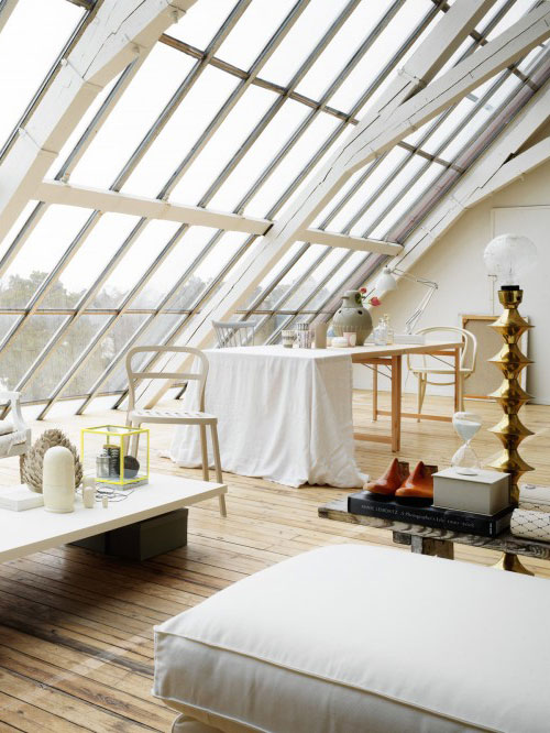 Un gran ático, muy luminoso, con techo de cristal, suelos de madera clara en listones de gran formato y con detalles y accesorios en tonos neutros. Un diseño de interior realizado por el sueco Lagerman Nanna donde el orden y la sencillez se refleja especialmente en la ausencia de estampados tanto en tapicerías y textiles como en objetos de decoración. Las paredes son casi todas de cristal lo que permiten una escasa decoración de elementos verticales en pared.