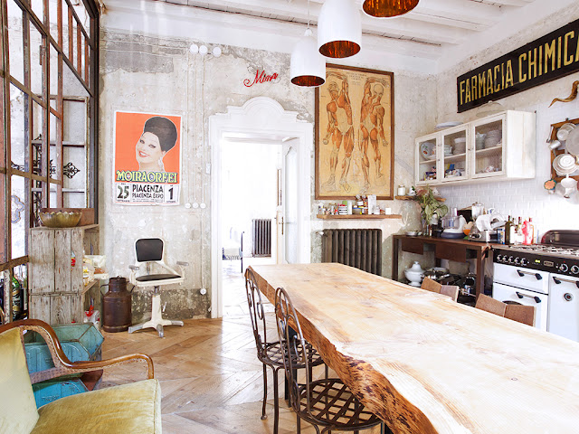 Una joven pareja de acumuladores de tesoros vintage, han creado un úncio espacio de vida y trabajo en el corazón de la ciudad de Milán, al más puro estilo loft industrial: The Chic Fish House & Studio. Renovar este apartamento fue un reto para la pareja que lo compró. El resultado sólo podía partir de la recuperación y recolección de objetos vintage, piezas de la que no se separan durante años y que les acompañan de casa en casa. Muchos materiales de reciclaje como la madera de los tablones de andamio, se utiliza en los suelos, el vitral provenía de una antigua fábrica de Fiat de Turín… Todo ha sido elegido con gran cuidado, nada se ha dejado al azar, creando una armonía en estilo industrial vintage de 10, con cierto aspecto decadente. ¡Me encanta!