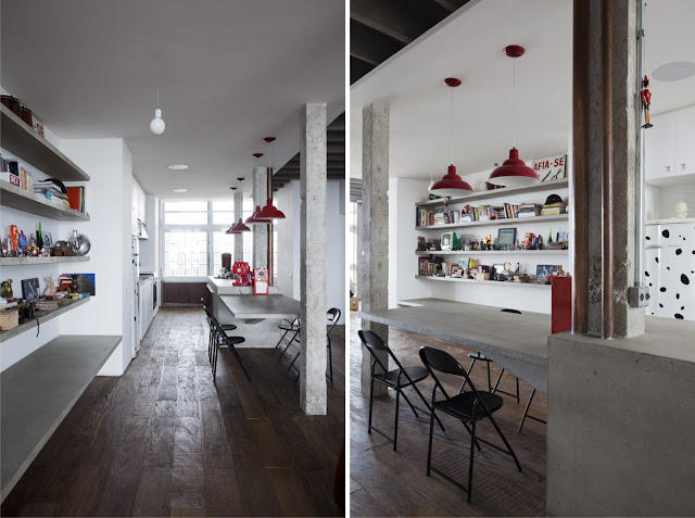 Durante la demolición, las vigas y las losas originales fueron descubiertas para quedar expuestas en la reconversión de éste apartamento en loft. Un techo de escayola blanca aparece en algunas para dar más sensación de calidez a esas zonas.