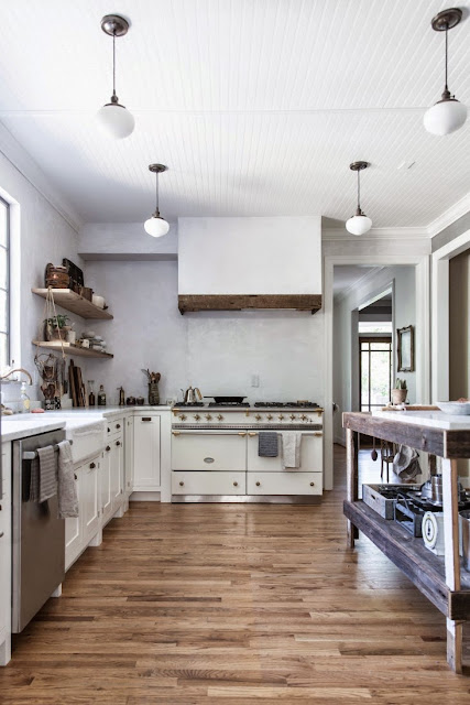 Al ser estilista, todo está cuidado al detalle, estantes abiertos que se alinean en la pared entre la cocina y el fregadero, las luces colgantes de estilo vintage, el mármol francés de las encimeras, cada uno de los utiensilios de cocina, etc, todo un ejercicio de estilo vintage y de mercado de pulgas que funciona. Se integró la nevera grande en el conjunto mediante la construcción de armarios a su alrededor. El grifo del fregadero es un diseño de latón y cobre francés vintage maravilloso. El fregadero recuerda a una naturaleza muerta con las paredes moteadas que añaden profundidad con la luz de la estancia. Me encanta el aspecto algo decadente del espacio.