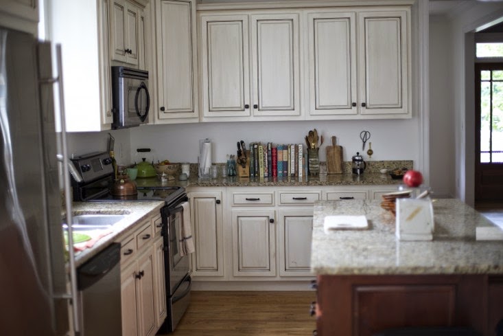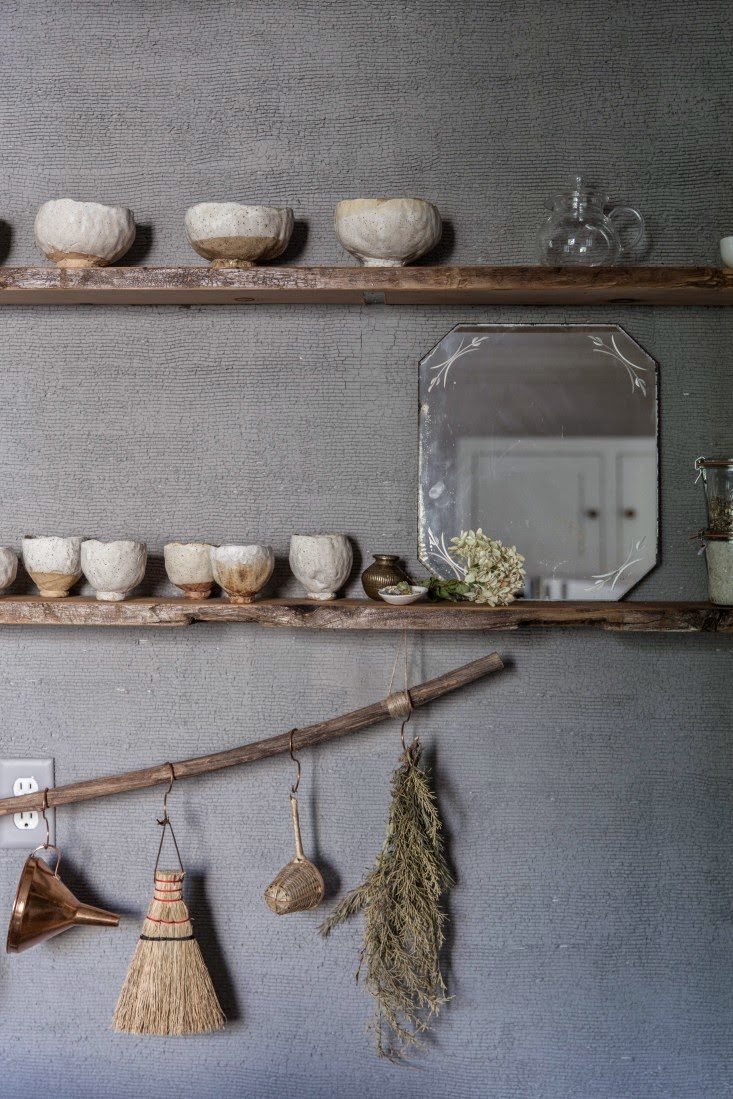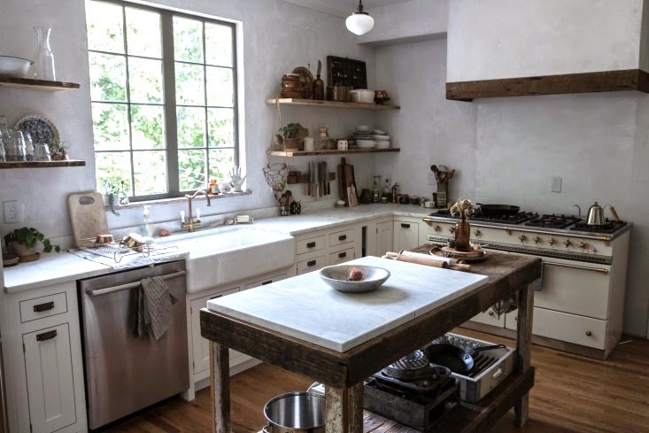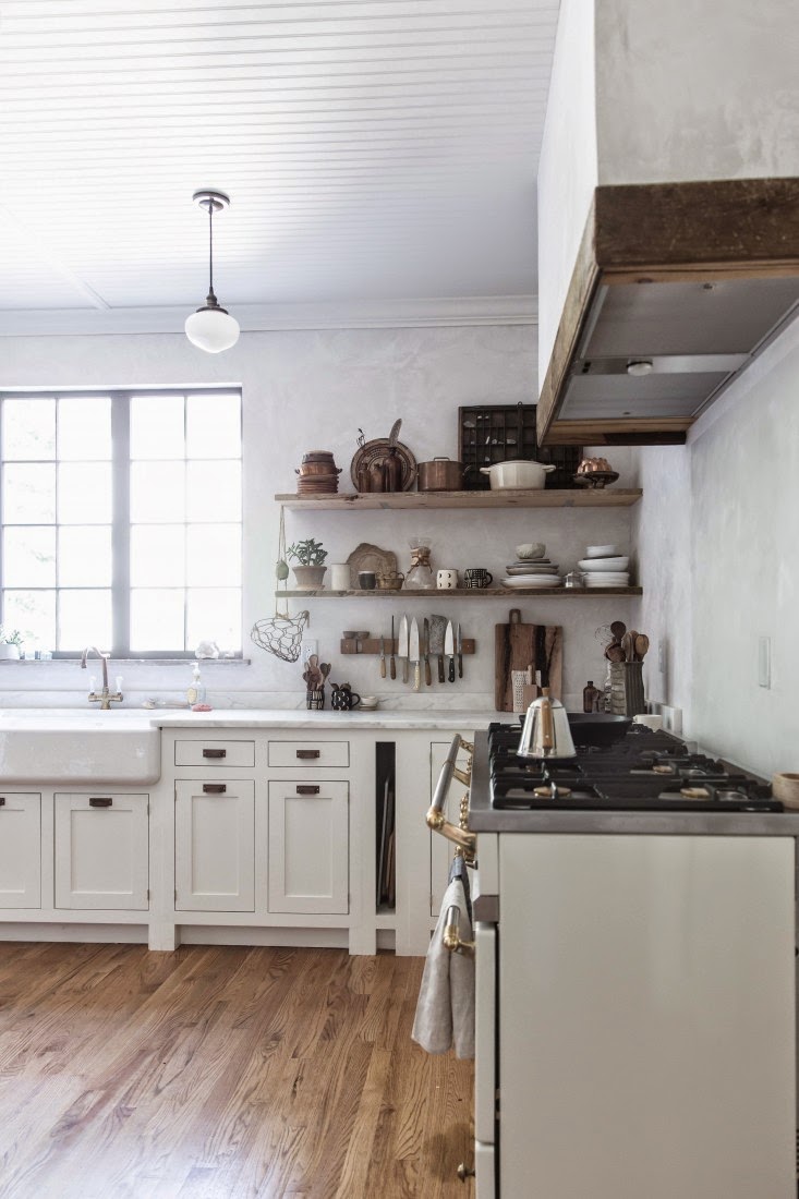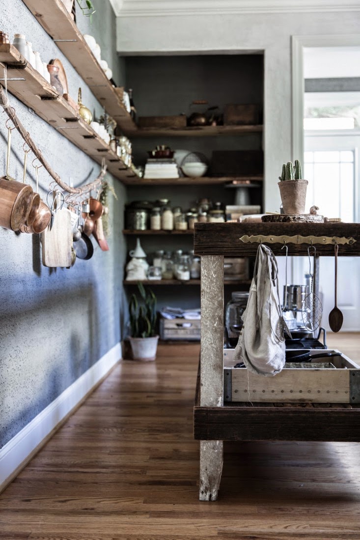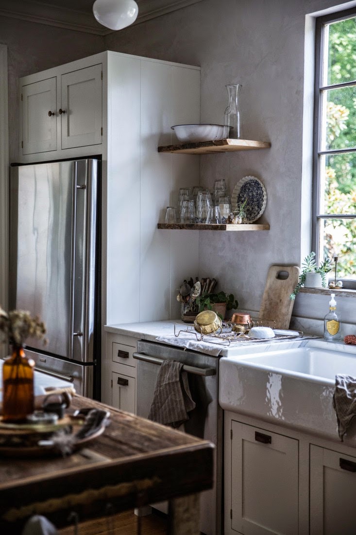 Al ser estilista, todo está cuidado al detalle, estantes abiertos que se alinean en la pared entre la cocina y el fregadero, las luces colgantes de estilo vintage, el mármol francés de las encimeras, cada uno de los utiensilios de cocina, etc, todo un ejercicio de estilo vintage y de mercado de pulgas que funciona. Se integró la nevera grande en el conjunto mediante la construcción de armarios a su alrededor. El grifo del fregadero es un diseño de latón y cobre francés vintage maravilloso. El fregadero recuerda a una naturaleza muerta con las paredes moteadas que añaden profundidad con la luz de la estancia. Me encanta el aspecto algo decadente del espacio.