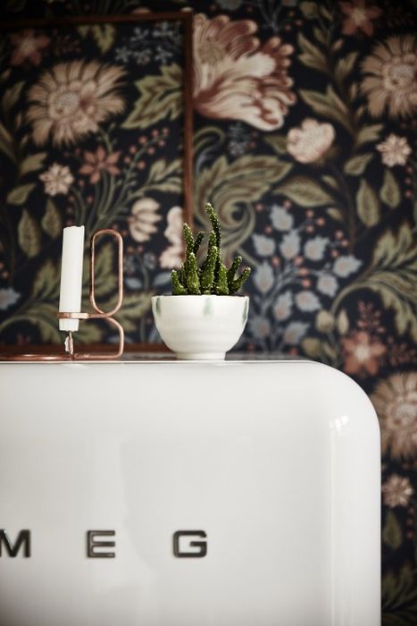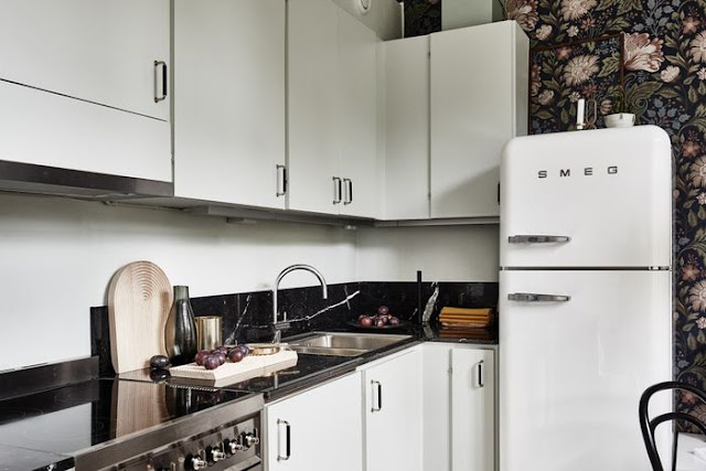 * La tercera cocina, es digna de atención, provocando sentimientos cálidos que nos retrotraen a tiempos pasados. Su diseño es cómodo y práctico al mismo tiempo. El pequeño espacio de la cocina no supone un obstáculo para una decoración de lujo, como es el caso de una de las paredes con papel tapiz de flores. un maravilloso y pequeño comedor integrado en la zona de mobiliario de cocina. Todos los utensilios de cocina quedan escondidos en los armarios de almacenaje a medida a lo largo de toda la pared. Las encimeras de granito negro le aportan al espacio un toque de elegancia. La cocina resulta, al mismo tiempo, contenida, elegante y romántica con esa zona de banco corrido en la pared de papel. El solado de listones de madera natural y la Smeg, rematan el diseño personal y muy femenino de esta mini cocina.