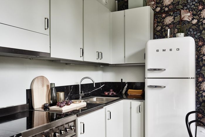* La tercera cocina, es digna de atención, provocando sentimientos cálidos que nos retrotraen a tiempos pasados. Su diseño es cómodo y práctico al mismo tiempo. El pequeño espacio de la cocina no supone un obstáculo para una decoración de lujo, como es el caso de una de las paredes con papel tapiz de flores. un maravilloso y pequeño comedor integrado en la zona de mobiliario de cocina. Todos los utensilios de cocina quedan escondidos en los armarios de almacenaje a medida a lo largo de toda la pared. Las encimeras de granito negro le aportan al espacio un toque de elegancia. La cocina resulta, al mismo tiempo, contenida, elegante y romántica con esa zona de banco corrido en la pared de papel. El solado de listones de madera natural y la Smeg, rematan el diseño personal y muy femenino de esta mini cocina.
