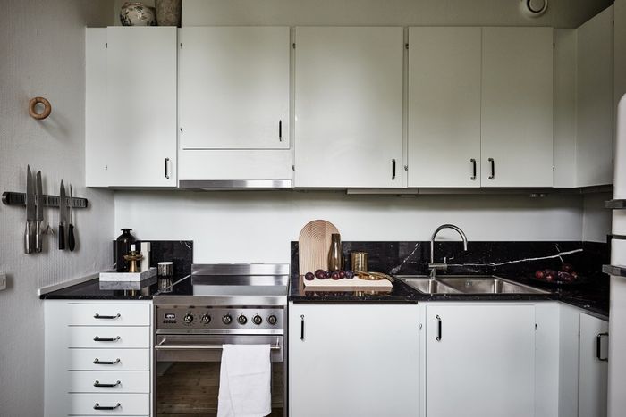 * La primera cocina basa su paleta en el color blanco brillante y con un desarrollo muy ordenado, discreto y elegante. No hay decoración superflua o estallidos de color vibrantes. Los utensilios de cocina están en su mayoría ocultos, y lo que queda a la vista está ordenado de forma limpia y sencilla. En un pequeño espacio, encuentramos un lugar incluso para una pequeña biblioteca culinaria y el contraste lo aporta la columna de instalaciones revestida de ladrillo cara vista, aportando un toque de calidez a un conjunto tan claro y luminoso. La cocina está decorada en estilo escandinavo con un toque vintage, tendencia estos últimos años. Con casi un aspecto minimalista en paleta neutra y colores pastel y con el ladrillo que recuerda la edad de la casa, los muebles y la iluminación apoyan una línea decorativa con acentos retro.